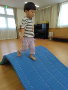 マットの山をジャンプ!! お友達と一緒に『ラーメン体操』を踊っています🎵