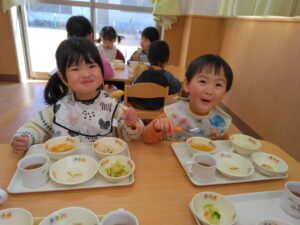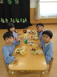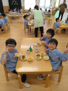 さくらぐみ、ゆりぐみ、ばらぐみはホールで会食をしました🍴