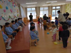 お別れ会では、年中組が中心となって会をすすめ、プレゼント交換をしたり、歌のプレゼントをしたり、ホールで会食をしたりして楽しいひと時を過ごしました。